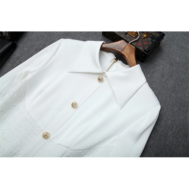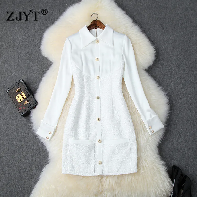 Promo 2019 New Autumn Winter Runway Dress Women Elegant Designer Turn Down Collar Full Sleeve White Tweed