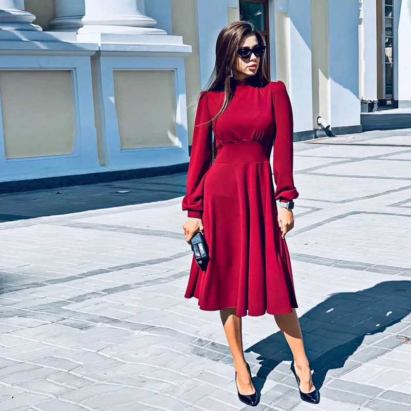 SALE Women Vintage a Line Party Dress Ladies Lantern Sleeve o Neck Elegant Fashion 2019 New Winter Autum
