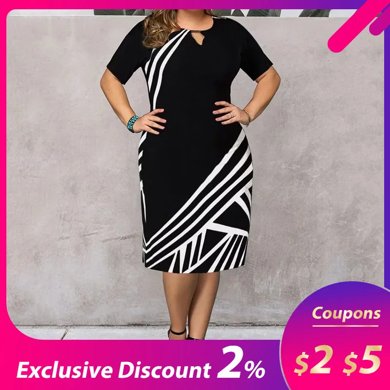 Promo Vintage Sexy Striped Print Bodycon Midi Dress Popular Large Size Women Round Neck Short Sleeve Fema