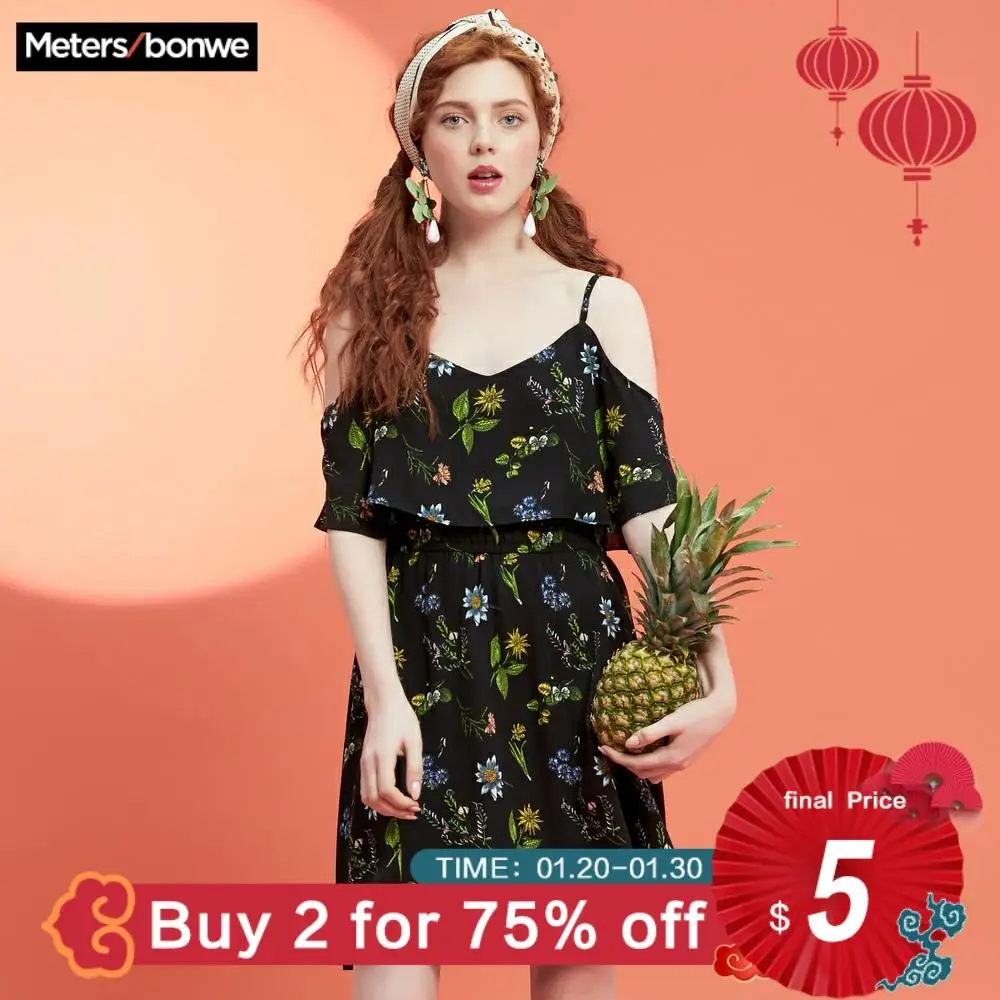 Best Product Metersbonwe brand 2019 Vintage black women's resort chiffon dress sweet floral beach dress halter s